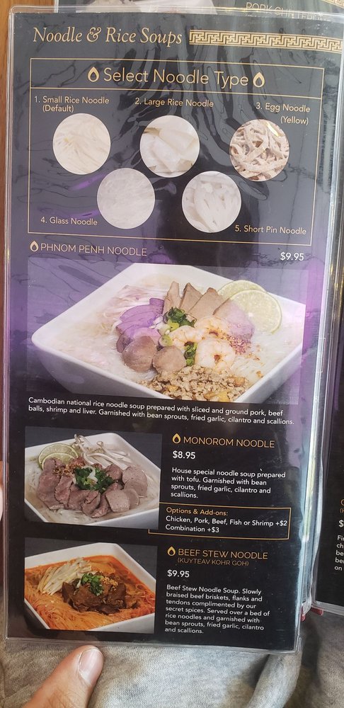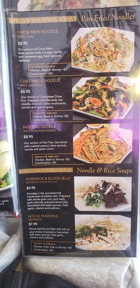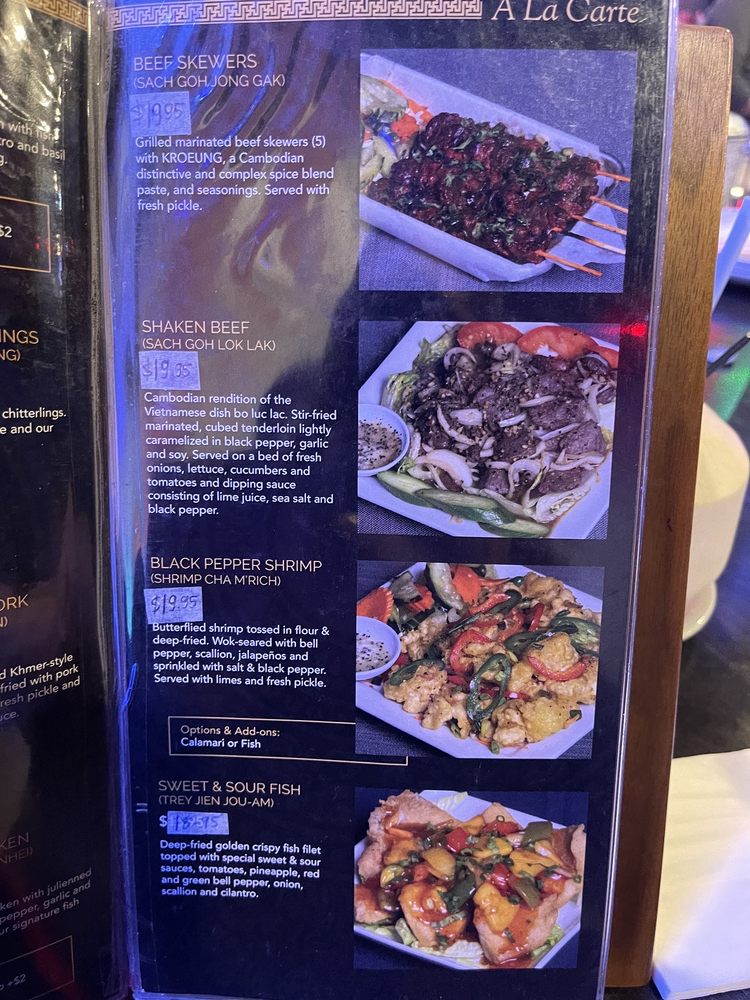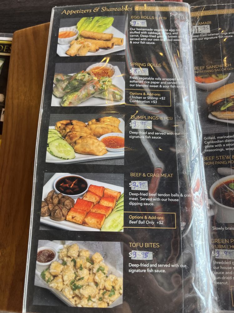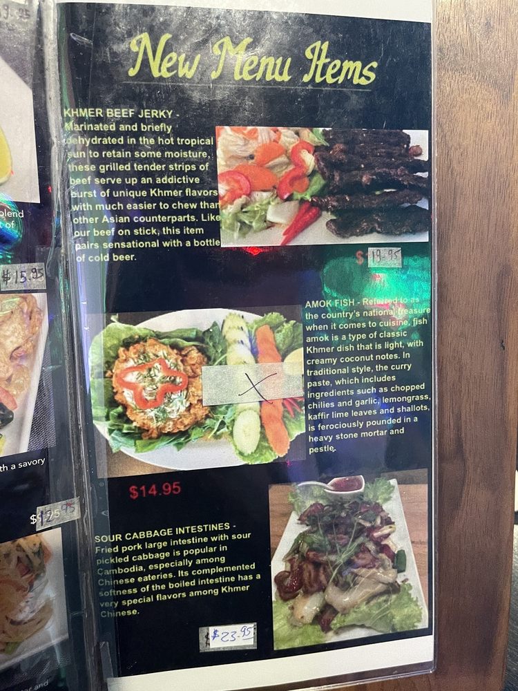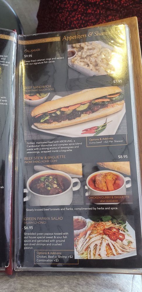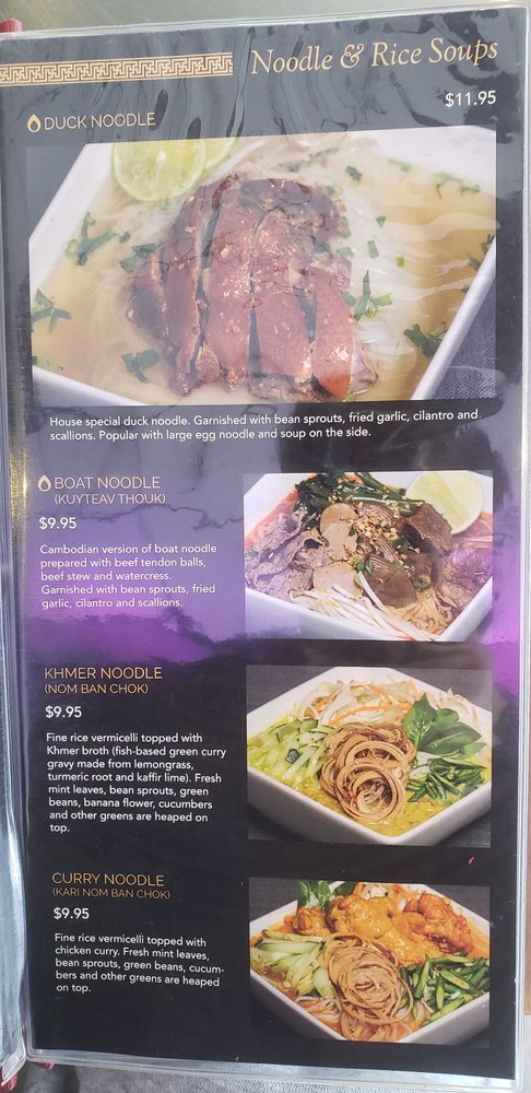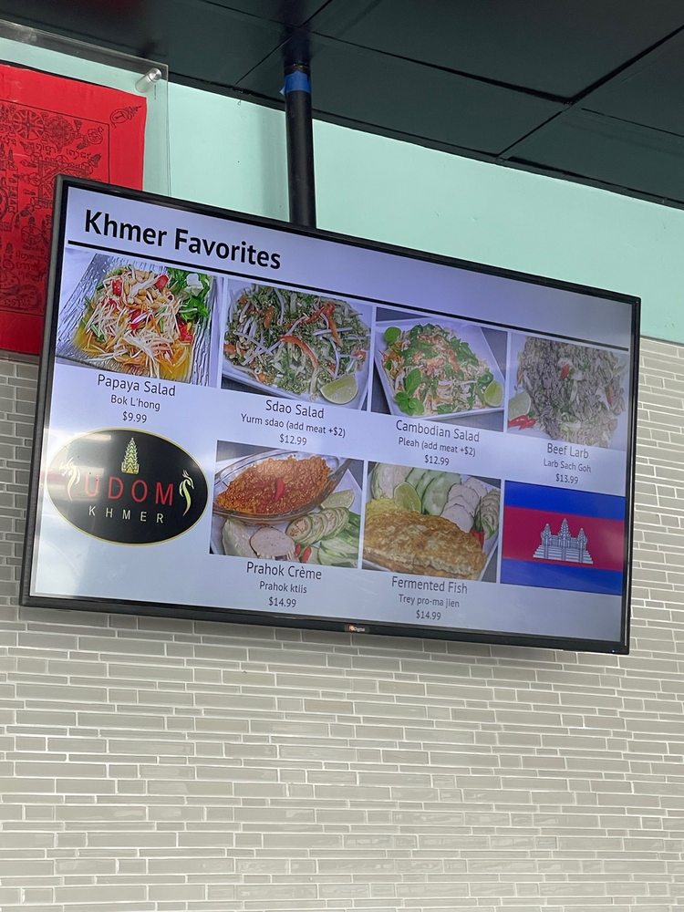 Introducing the menu at Udom Khmer Restaurant is a delightful experience for those seeking authentic Cambodian cuisine. Offering a variety of snacks and finger foods like Nom Bao, Cha Quai, and Akou Tnot, this restaurant sets the stage for a flavorful journey. Appetizers and shareables such as Egg Rolls, Spring Rolls, and Dumplings showcase the rich flavors and textures of Khmer cuisine. Customer reviews praise the Ginger Chicken, Phnom Penh Noodle, and Cambodian Iced Coffee for their deliciousness and affordable prices. The ambiance and live band performances create a vibrant and festive atmosphere, making Udom Khmer Restaurant a must-visit dining destination. The Famous Roasted Duck, Fried Pork, and Red Curry with Chicken receive high marks for their flavorful sauces and generous portions. Overall, Udom Khmer Restaurant delivers a memorable dining experience filled with warmth, hospitality, and exceptional flavors.